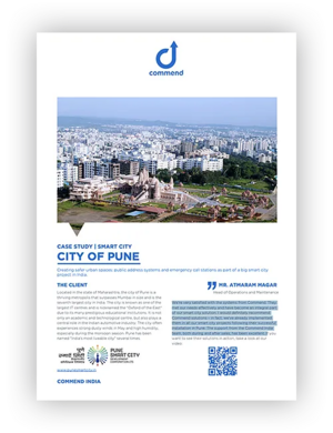 Die Commend-Lösung mit Beschallungsanlagen und Notrufsprechstellen ermöglicht es der Stadt Pune, die gesamte Stadt einfacher zu verwalten und zu überwachen und Warnungen auszugeben, z. B. bei Überschwemmungen während der Monsunzeit. Die modernen Beschallungsanlagen übermitteln kristallklar wichtige Sicherheitsmeldungen der Regierung.